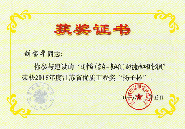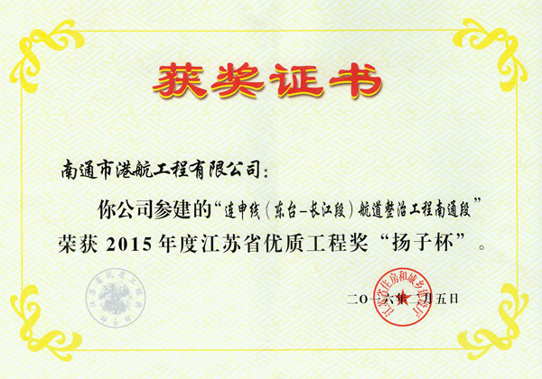 公司参建的“连申线(东台-长江段)航道整治工程南通段”荣获2015年度江苏省优质工程奖“扬子杯”